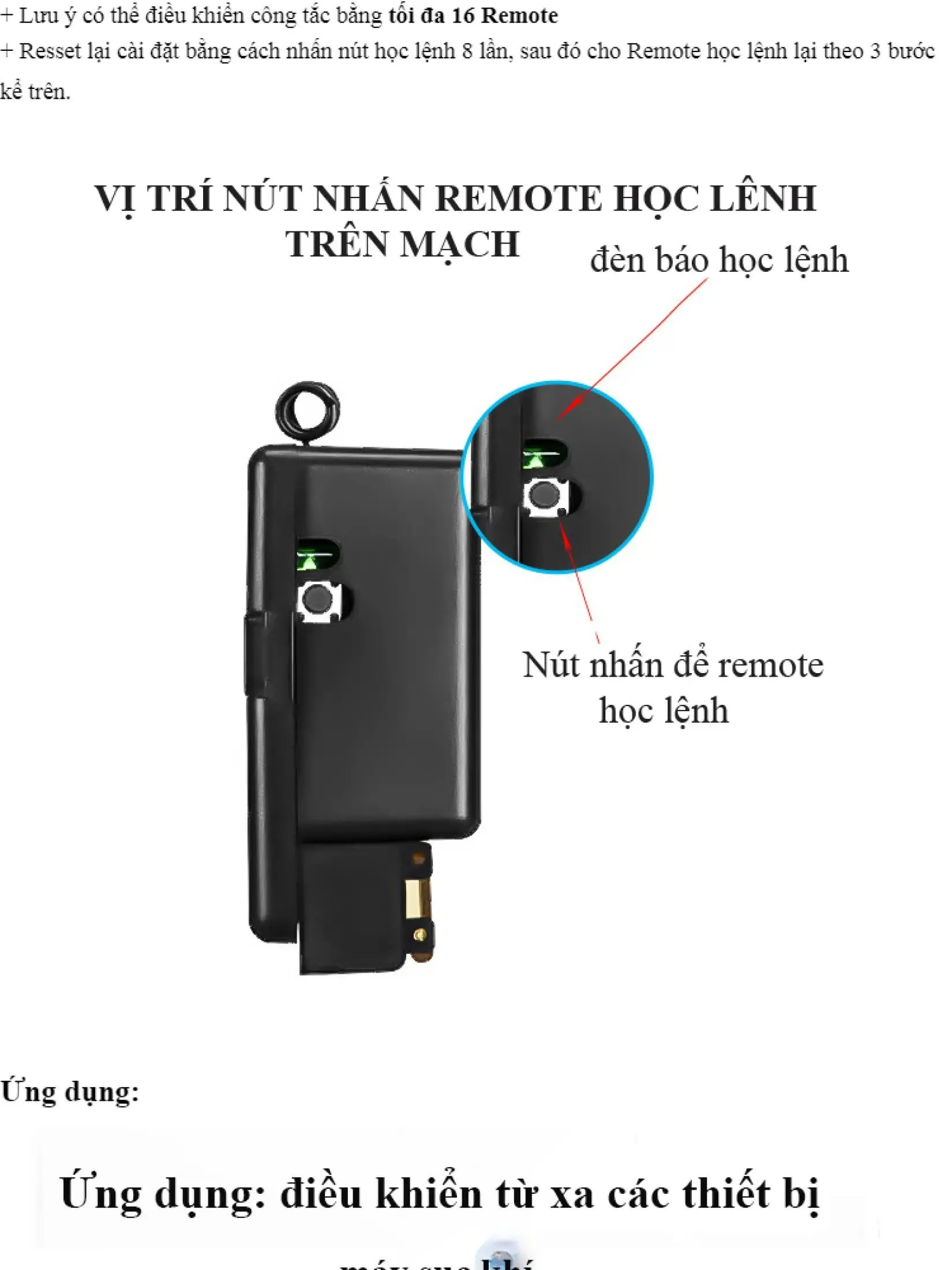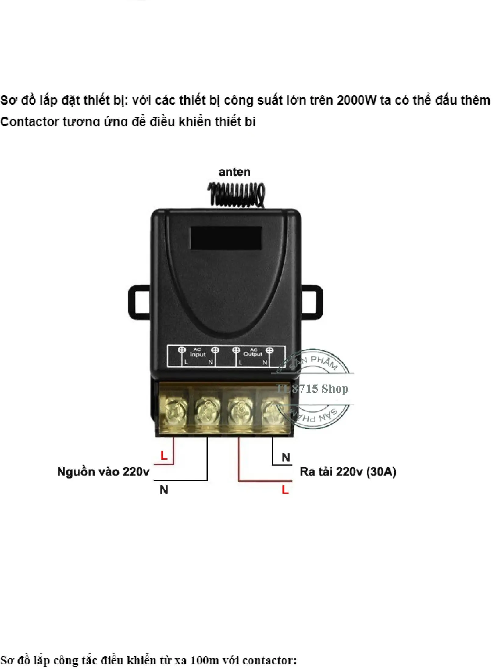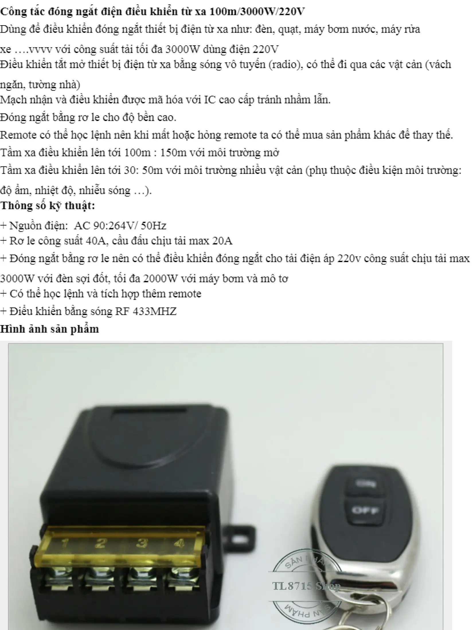 ● Dùng để điều khiển đóng ngắt thiết bị điện từ xa như: đèn, quạt, máy bơm nước ….vvvv với công suất tải tối đa 3000W.