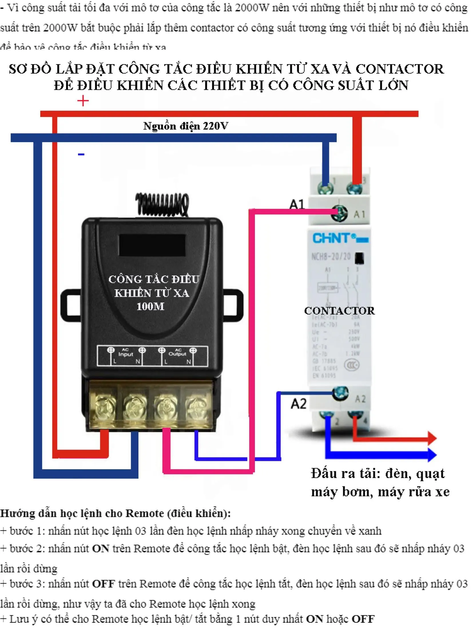 ● + Công suất chịu tải: max 3000W với đèn sợi đốt, max 2000W với mô tơ hoặc máy bơm nước